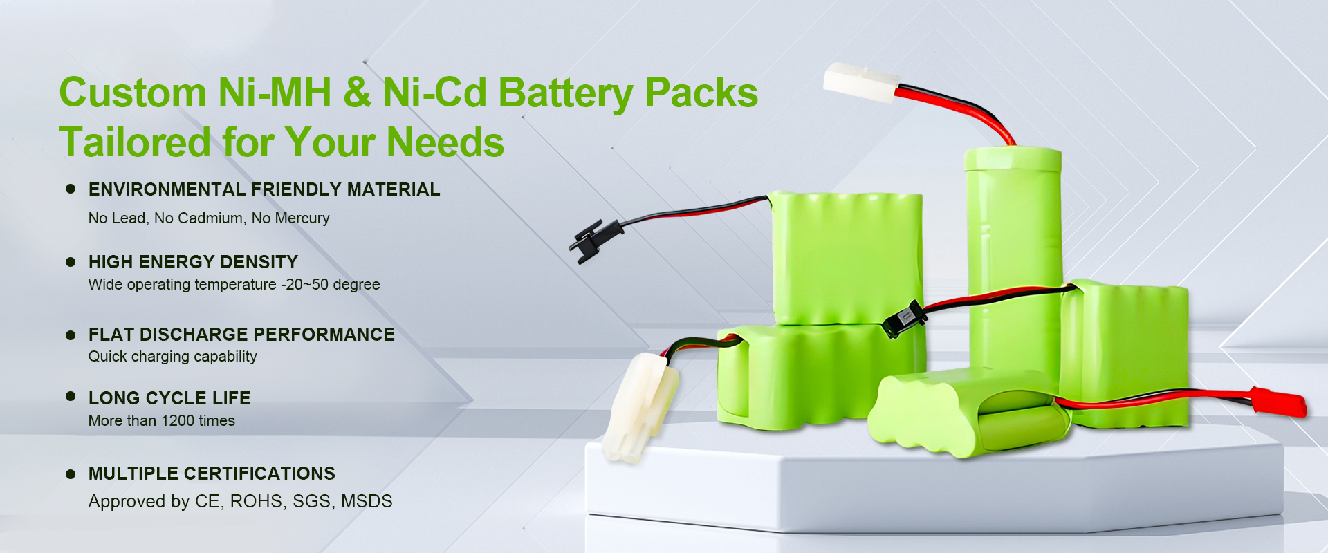 Zinc-carbon battery (R20/R14/R6 models), Button Cells (Lithium/Zinc-air/Alkaline series), Ni-MH & Ni-Cd battery/pack.